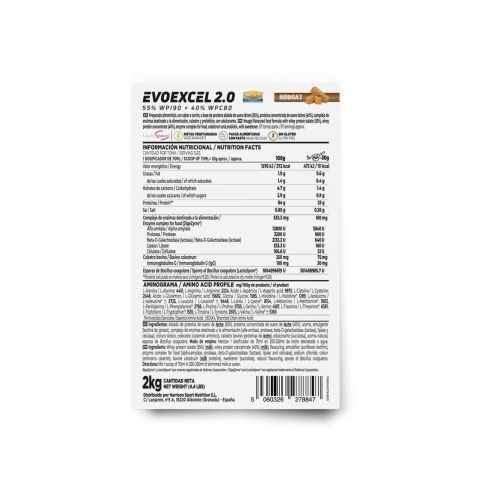 Evoexcel 2.0 is considered a perfect nutritionally high-quality protein, as it is developed entirely from dairy protein, which is regarded as a reference in the nutritional field for its protein content. Additionally, its formula has been complemented with DigeZyme®, an enzyme complex containing protease, amylase, lactase, cellulase, and lipase; Lactospore®, which are spore ferments from the species Bacillus coagulans, and bovine colostrum.