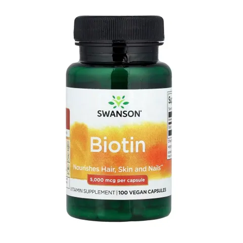 Biotin 5000 mcg from Swanson is a dietary supplement made with D-biotin (vitamin B3) in easy-to-take capsules.