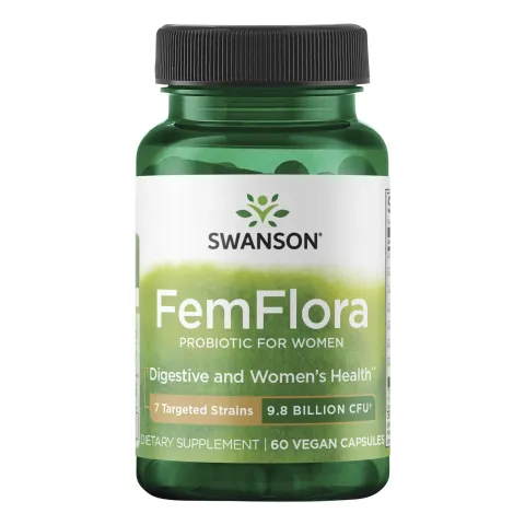 Femflora Probiotic for Women 9.8 Billion CFU by Swanson is a dietary supplement in vegetable capsules made with 7 strains of Lactobacilli.