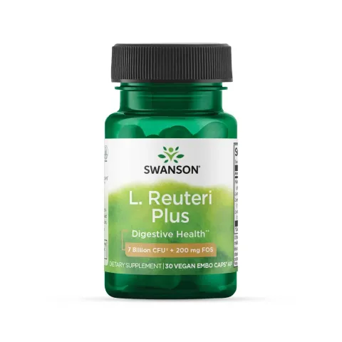 Lactobacillus Reuteri Plus 7 Billion CFU + 200mg FOS from Swanson is a dietary supplement in veggie capsules made with FOS and 3 bacterial strains.