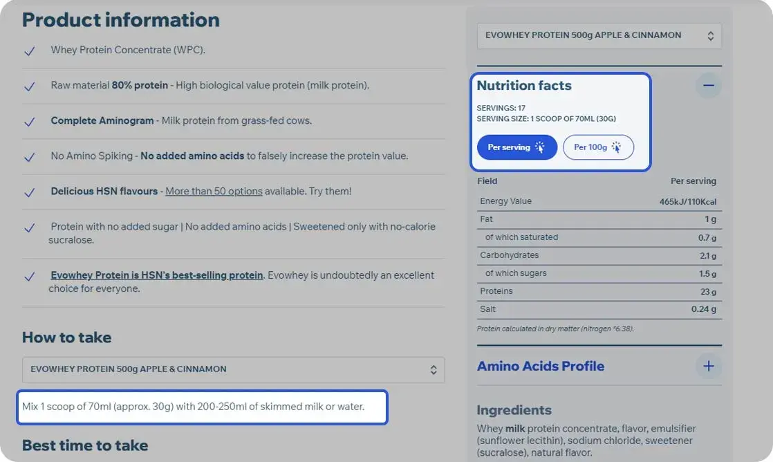 - Once inside, you can go to the ‘Nutritional info’ section of the product, where it specifies the recommended serving size.