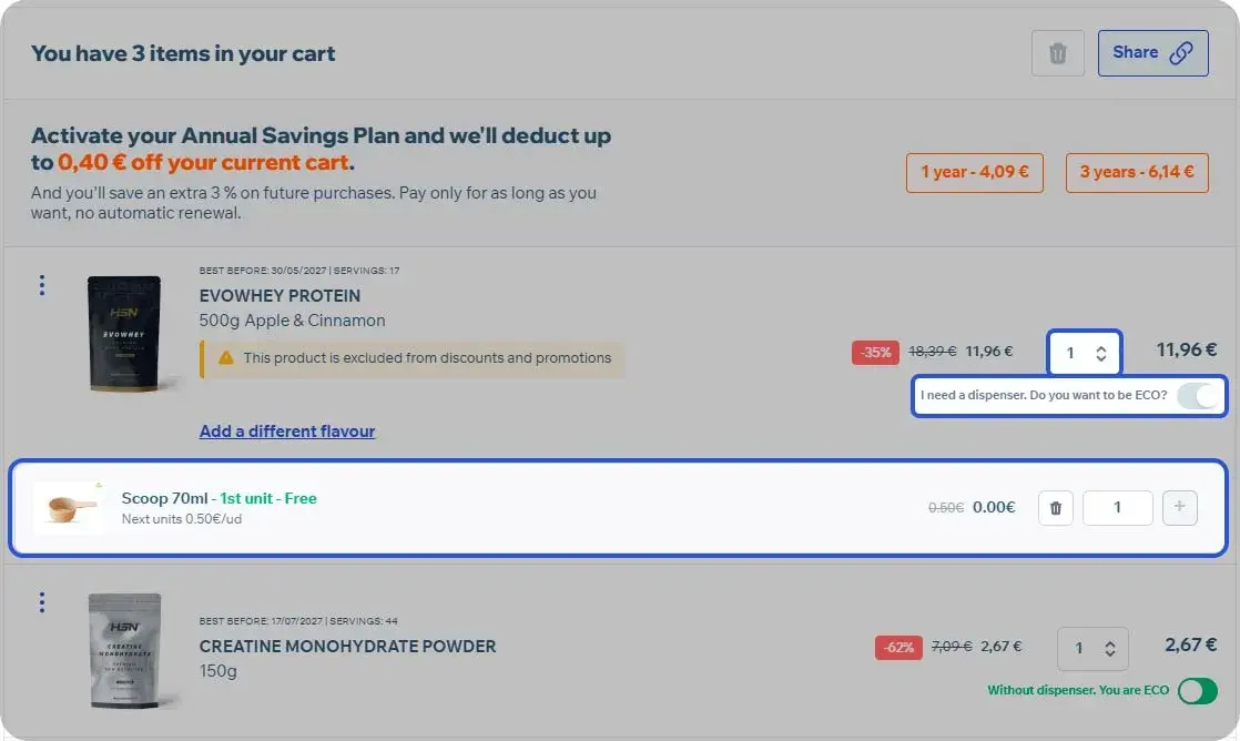 For example, as shown in the image, you've added a 500g bag of Evowhey Protein to your shopping cart, which requires a 70ml scoop. You've also added a 150g bag of Evofuel to your order, selecting the option for a scoop (which has the same dimensions as the one for Evowhey Protein). The first scoop is free, while the second one incurs the additional charge. The recommended serving size for both Evowhey Protein and Evofuel is 70ml.
