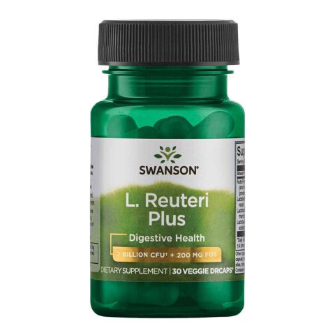 Lactobacillus Reuteri Plus 7 miliardów CFU + 200 mg FOS od Swanson to suplement diety w kapsułkach roślinnych, oparty na FOS i 3 szczepach bakterii.