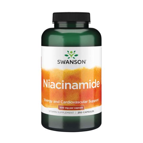 Niacynamid 500 mg od Swanson to suplement diety zawierający niacynę (witaminę B3) w kapsułkach o wysokim stężeniu.