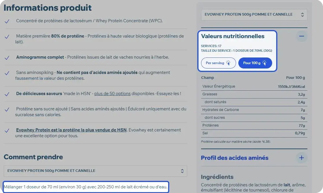 - Wejdź na stronę produktu i przejdź do zakładki „Info żywieniowe”, gdzie znajdziesz zalecaną wielkość porcji.